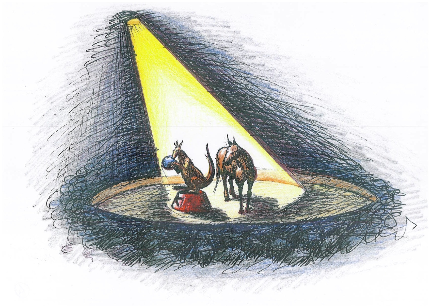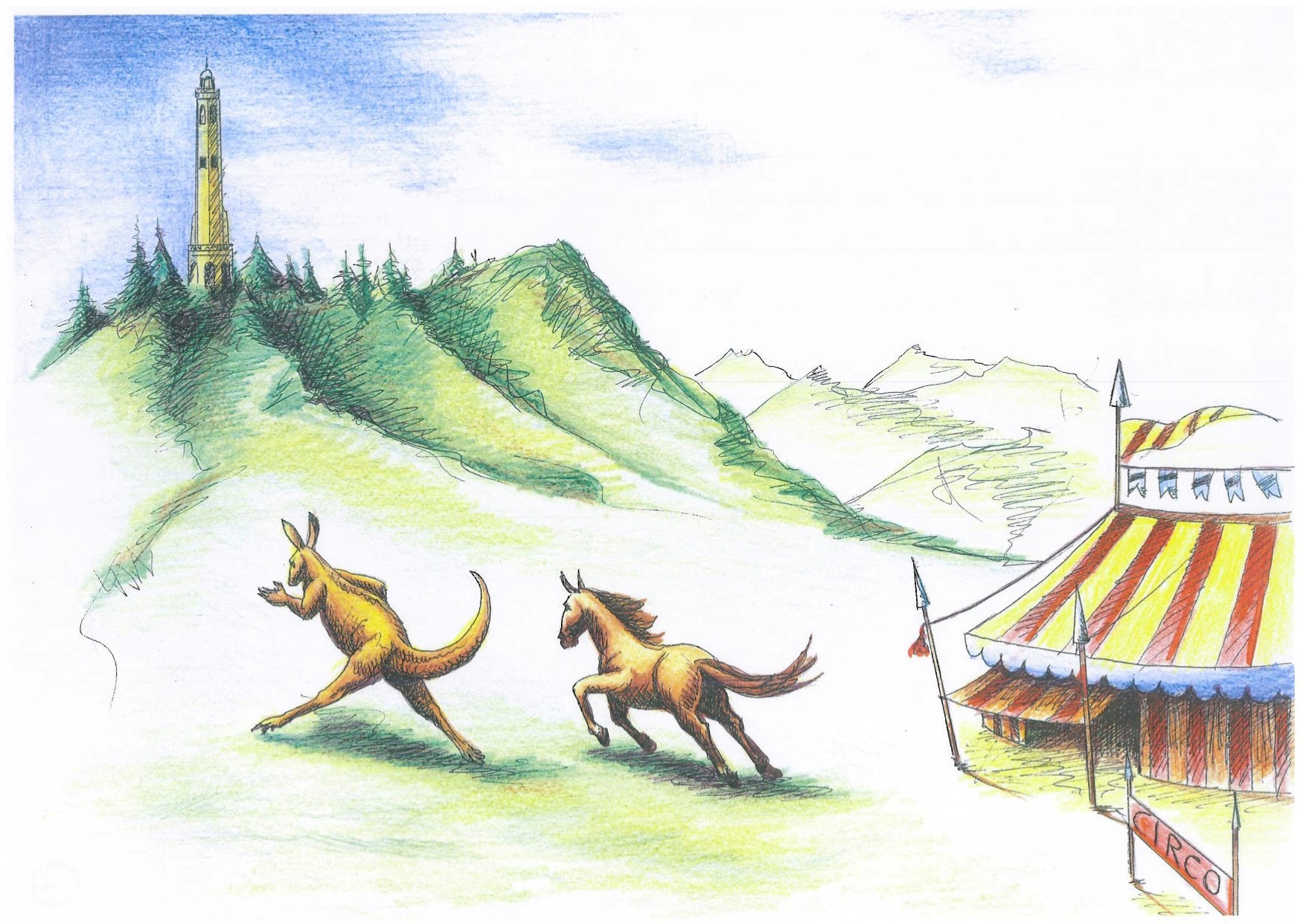 Allora, guardando la luce tricolore, il papà disse: “Ci vorrebbe un cavallo per portare sulla groppa me, mia moglie e mia figlia e un canguro per portare il piccolo nel suo marsupio”. In quel momento comparve il kangucavallo, per metà cavallo e per metà canguro, che esaudì il loro desiderio.